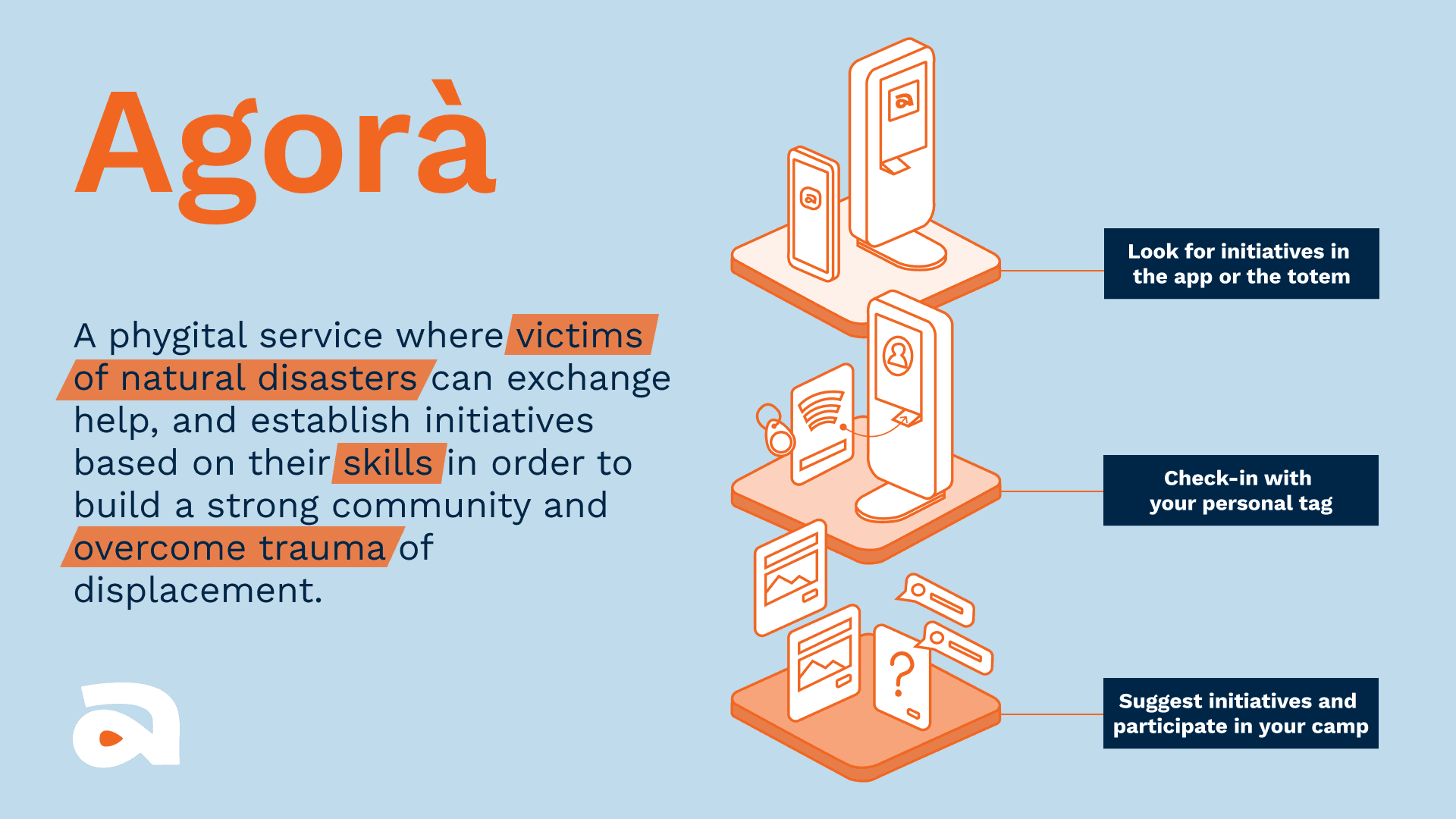 Project Agorà is a physical and digital (phygital) service designed for victims of natural disasters and Protezione Civile volunteers in displacement camps. The initiative aims to foster resilience and community building by providing a streamlined system for communication, resource allocation, and activity organization where individuals can collaborate, share skills, and navigate challenges.